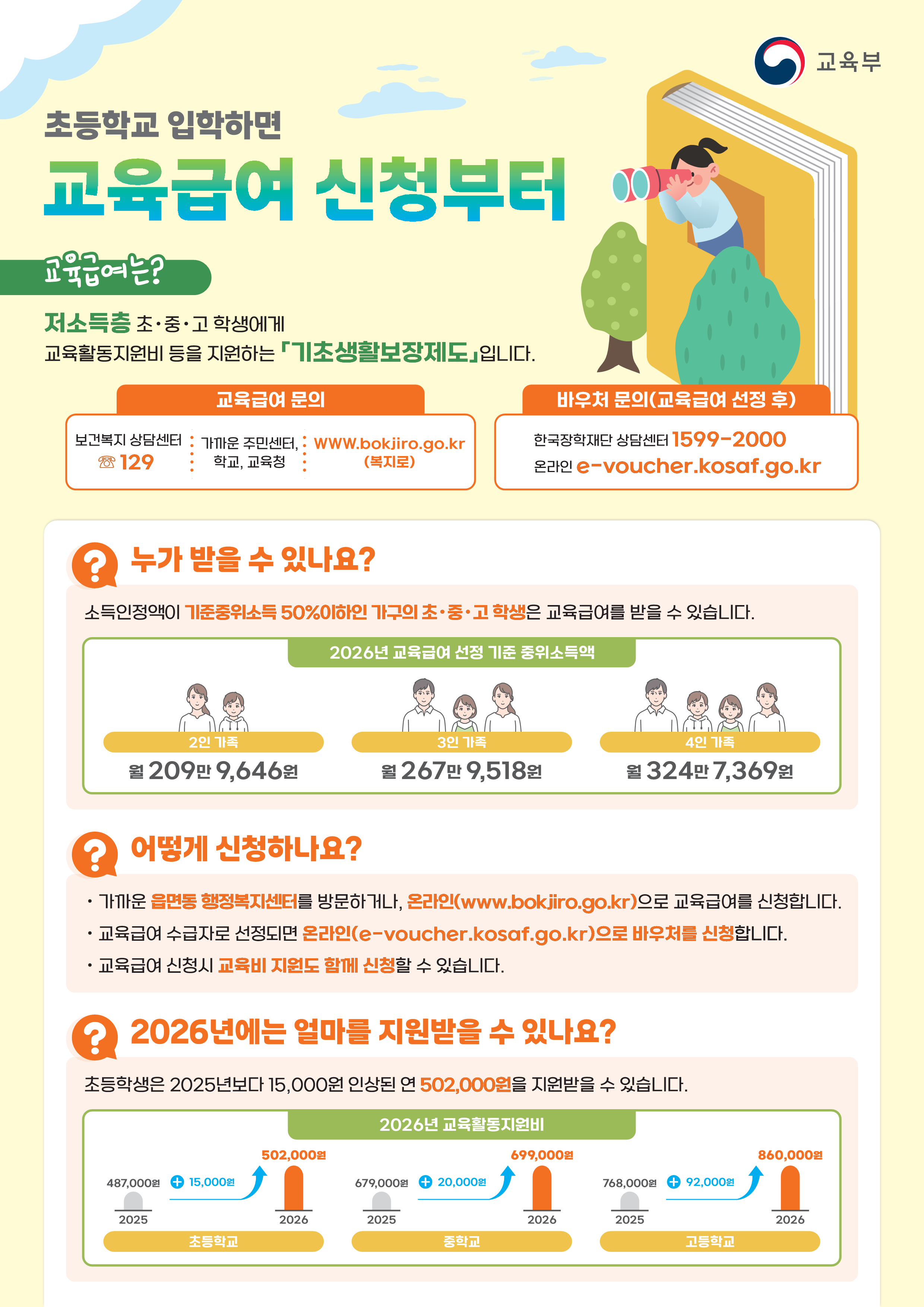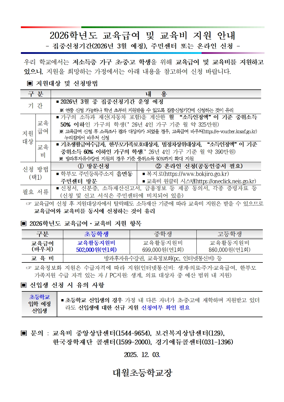 2026학년도 교육급여 및 교육비 지원 안내(신입생 및 재학생)